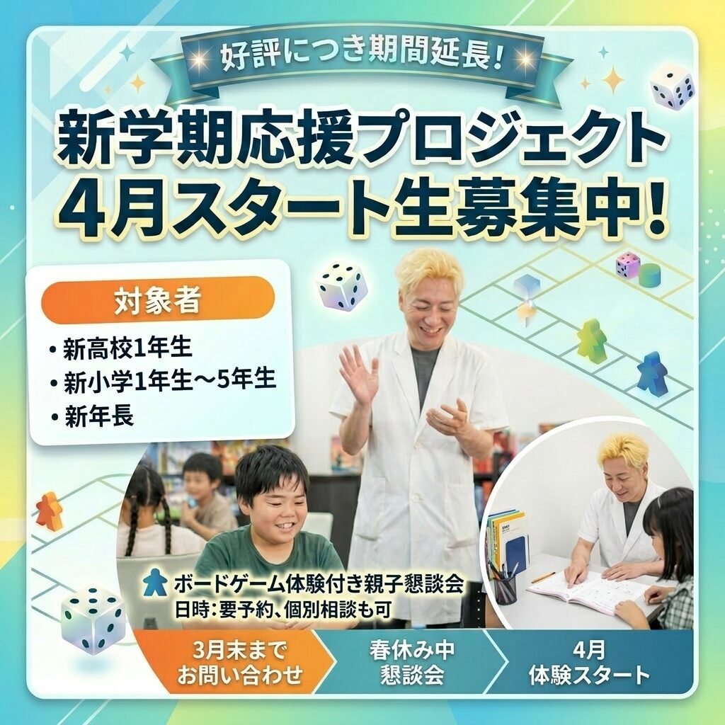 この教室は、開業18年目を迎えた実績ある学習塾と、日本ボードゲーム教育協会理事のボドゲ先生が指導するボードゲーム教室を併設した、全く新しい学びの場です。